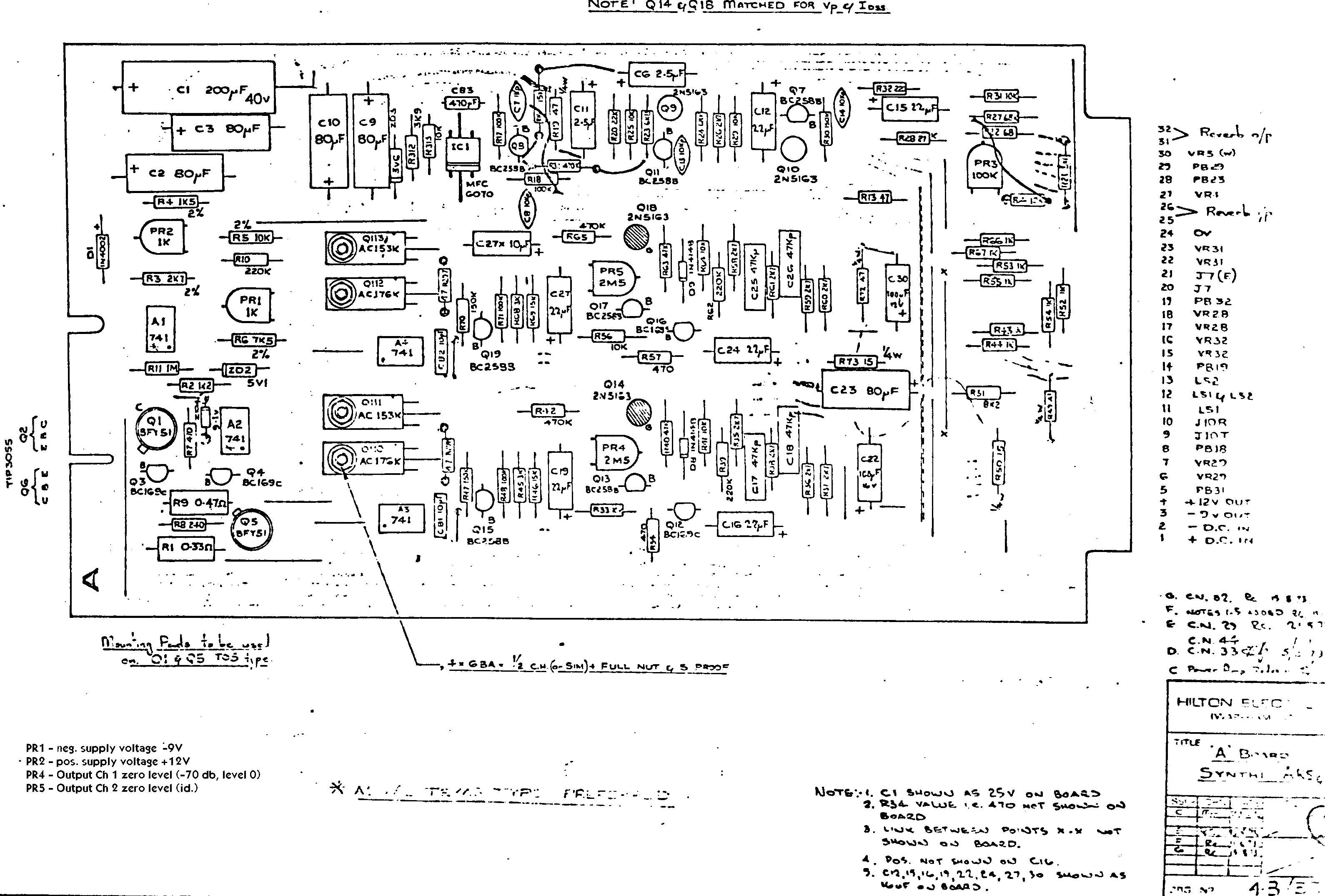 Location of the functions : Board A - Power stabilisation, Output amplifiers, Reverb amplifier Board B - Envelope shaper, Filter, Ring modulator, Input amplifiers Board C - Noise generator, Oscillators 1-2-3, Meter amplifier | ||