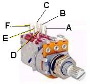Push-pull potsPush-pull pots are pots with a built-in switch, generally used in guitars and basses.These are available eg from Mouser or from potentiometers.com (who can supply with expensive custom pots). ![]() when you pull the switch the connection changes from B-C to B-A, and E-F to E-D. Use your meter's continuity setting to confirm your switch works the same way. The "middle" lugs (B & E) are the constant, the "outside" lugs ( A & C, D & F) are the connections you switch between. (from Deaf-Eddie's page) Some value seem hard to find for push-pull, a solution is to buy common pots of the same type and to replace the push-pull pot's resistive track. Push-pull pots are easy to disassemble, but the common pots don't (I had to break the shaft to get the part). This allows having any value you could want. |
